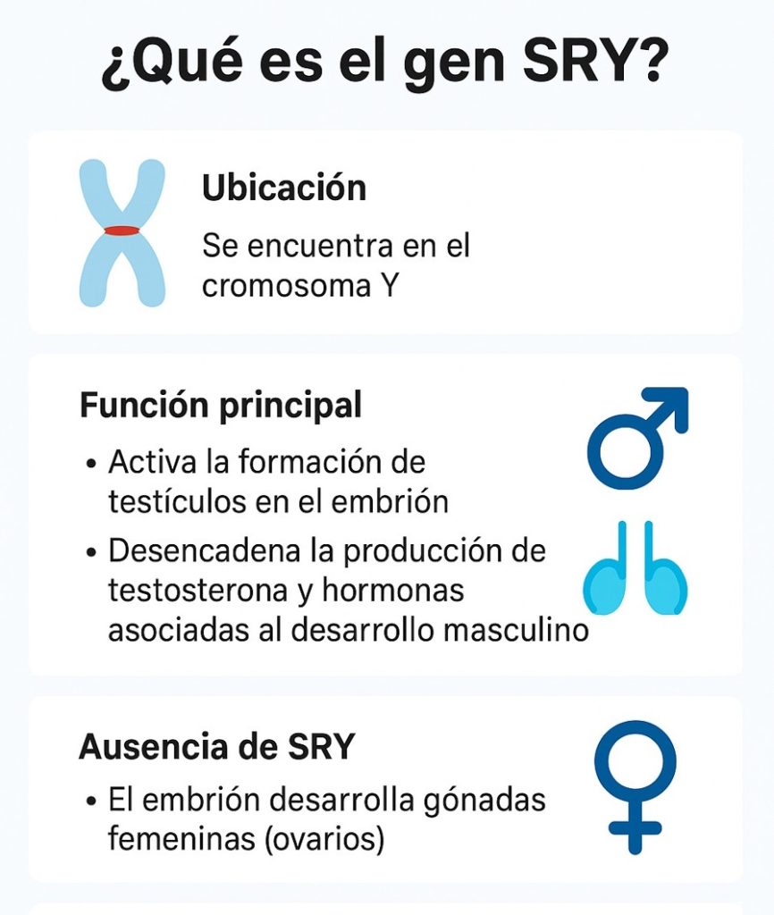 SRY (del inglés Sex-determining Region Y) es una proteína que controla el desarrollo de las gónadas indiferenciadas en órganos sexuales masculinos. Es decir, si está presente en el ADN de un embrión, este debe desarrollarse como hombre. Por eso la prueba es excluyente: si el resultado es positivo, usted, biológicamente, es hombre.